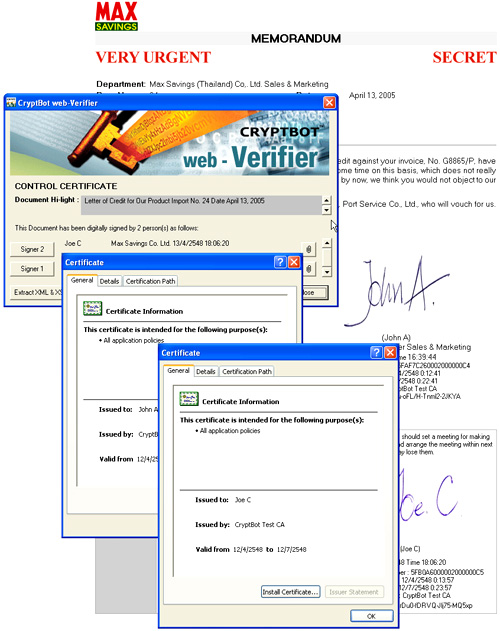 CryptBot web-Sign เพื่อลงนามแบบแสดงใบรับรองอิเล็กทรอนิกส์ หรือใช้เทคโนโลยี PKI (Public Key Infrastructure) ได้ 2 แบบ คือ Central PKI (ใช้กุญแจกลางของระบบ/องค์กร) และ แบบ Personal PKI (ใช้กุญแจส่วนบุคคลของแต่ละผู้ลงนาม) ซึ่งสามารถดูรายละเอียดได้ที่เมนู ศูนย์โบรชัวร์ |